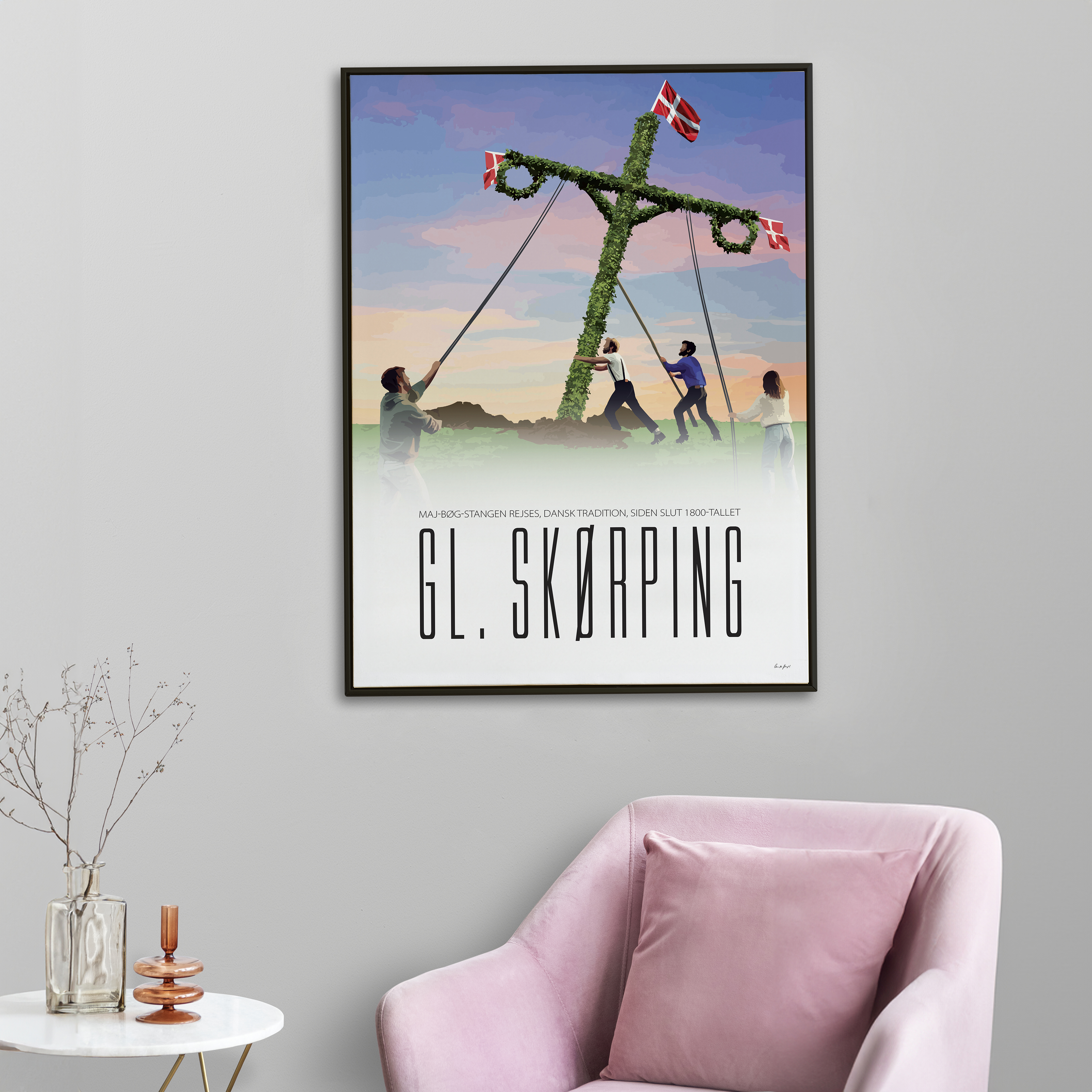 Plakaten fanger netop det øjeblik, hvor Majbøgen rejses, og vidner om den fine tradition, der fortsat holdes i hævd.